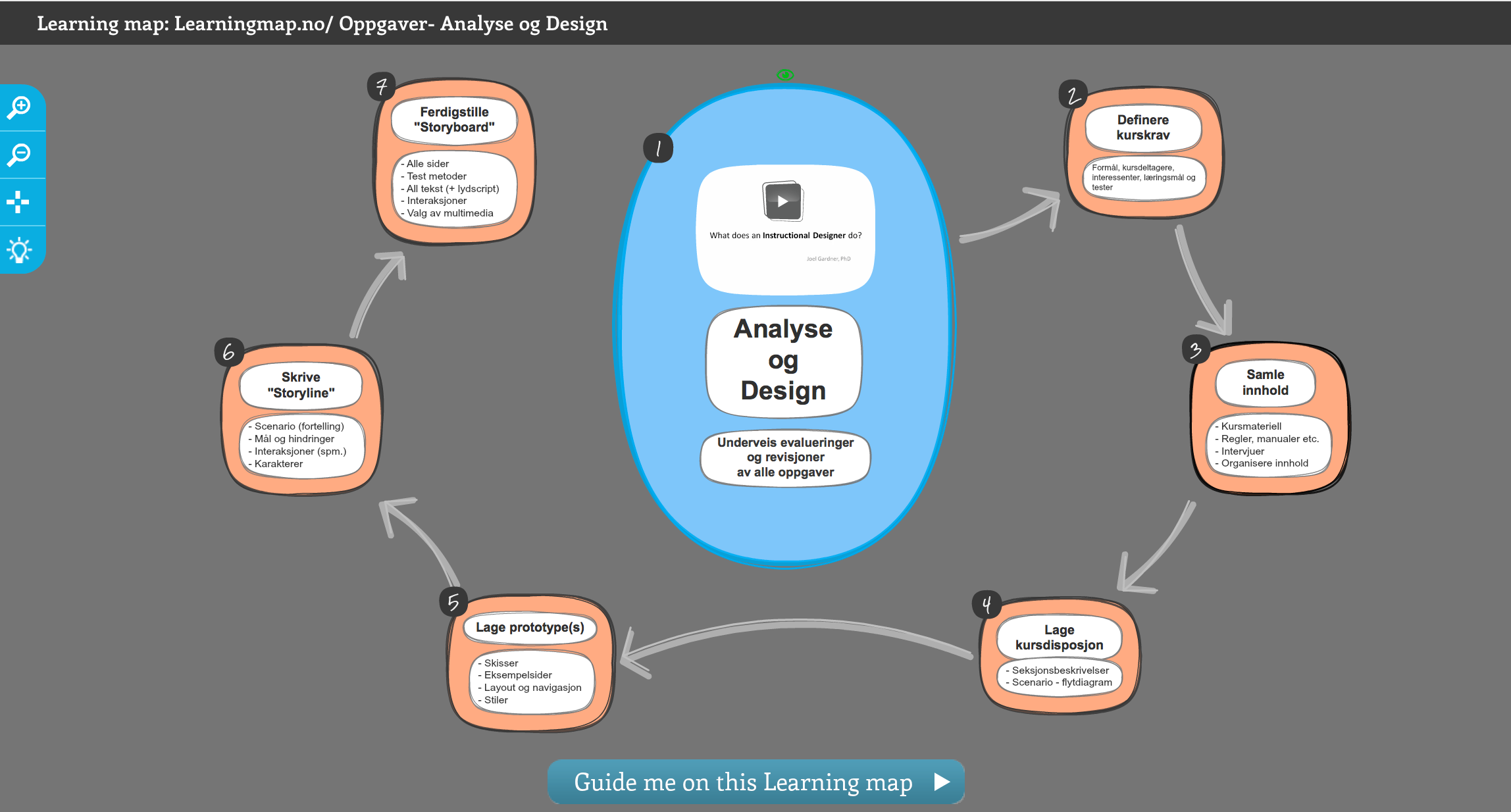 «Intructional design» er fagområde som gjerne oversettes til norsk med med læringsdesign. I dette læringskartet får du en «step-by-step» oversikt hvilke aktiviteter som normalt gjennomføres i en slik prosess. Klikk på bilde for større bilde. (Åpnes i ny fane)